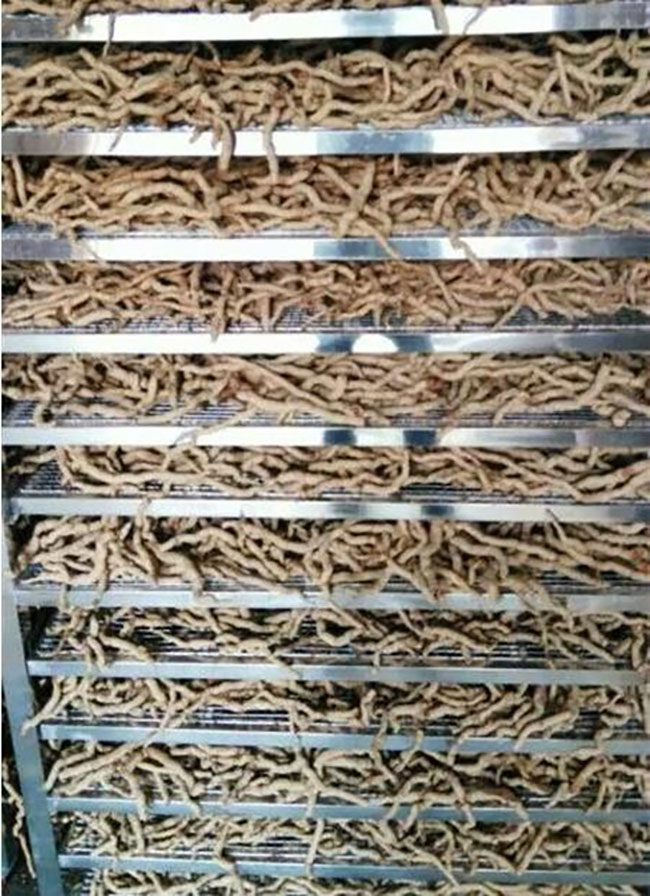 相比較傳經(jīng)的日曬或土爐加工,使用熱泵型的巴戟天烘干機(jī),其好處在哪里呢?巴戟天采收極有講究,工具應(yīng)清潔無污染,起挖時(shí)要小心翼翼,不能斷根、刮傷根皮。挖出之后,需要立即抖去泥土,剔除破損、腐爛變質(zhì)的部分,記錄采收地點(diǎn)和日期,再送去加工場(chǎng),清洗、修剪、烘干、抽芯。加工好的巴戟天,被送往陰涼庫妥善保存。根據(jù)藥典規(guī)定,巴戟天半成品水分含量本應(yīng)在15%以下,但因?yàn)槟戏娇諝鉂駶?rùn),要求更加嚴(yán)格,水分含量必須控制在10-11%。在對(duì)巴戟天進(jìn)行烘干加工前,須首先把巴戟洗干凈,切斷,然后放開水里面燙一下,再用篩盤裝起來推進(jìn)熱泵烘干機(jī)所匹配的烘干房中,用60~65的溫度對(duì)巴戟進(jìn)行烘干,十幾個(gè)小時(shí)候后就可以取出烘干了的,烘干效果很好干巴戟了。